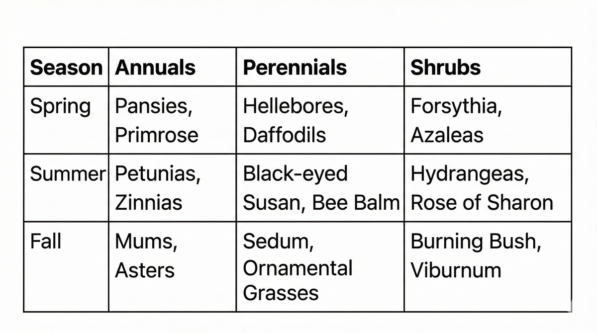 Create a planting calendar that considers bloom times, mature sizes, and maintenance requirements. Early spring is perfect for cool-season annuals like pansies, snapdragons, and sweet alyssum. Wait until after the last frost (typically mid-April) for warm-season plants like impatiens, begonias, and marigolds.