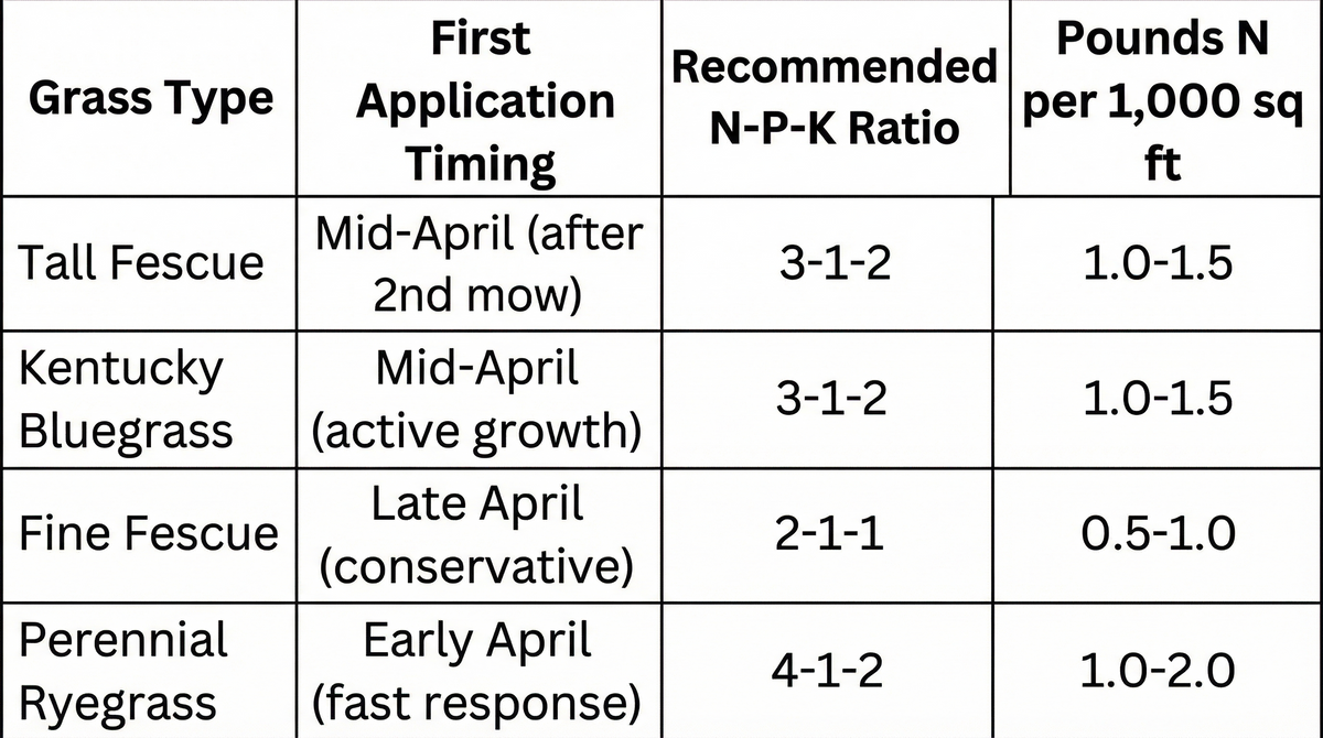For tall fescue and Kentucky bluegrass lawns, plan your first feeding when grass starts actively growing, usually when you've mowed twice. This typically falls in mid-April, though warmer springs may push this earlier. These grass types benefit from a balanced fertilizer with equal parts nitrogen, phosphorus, and potassium.